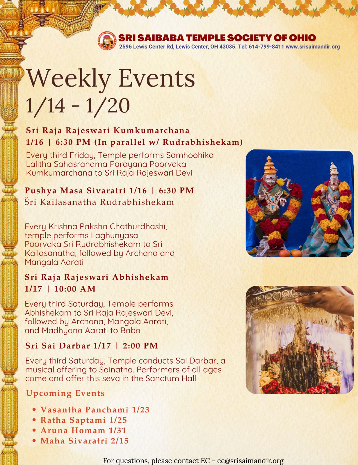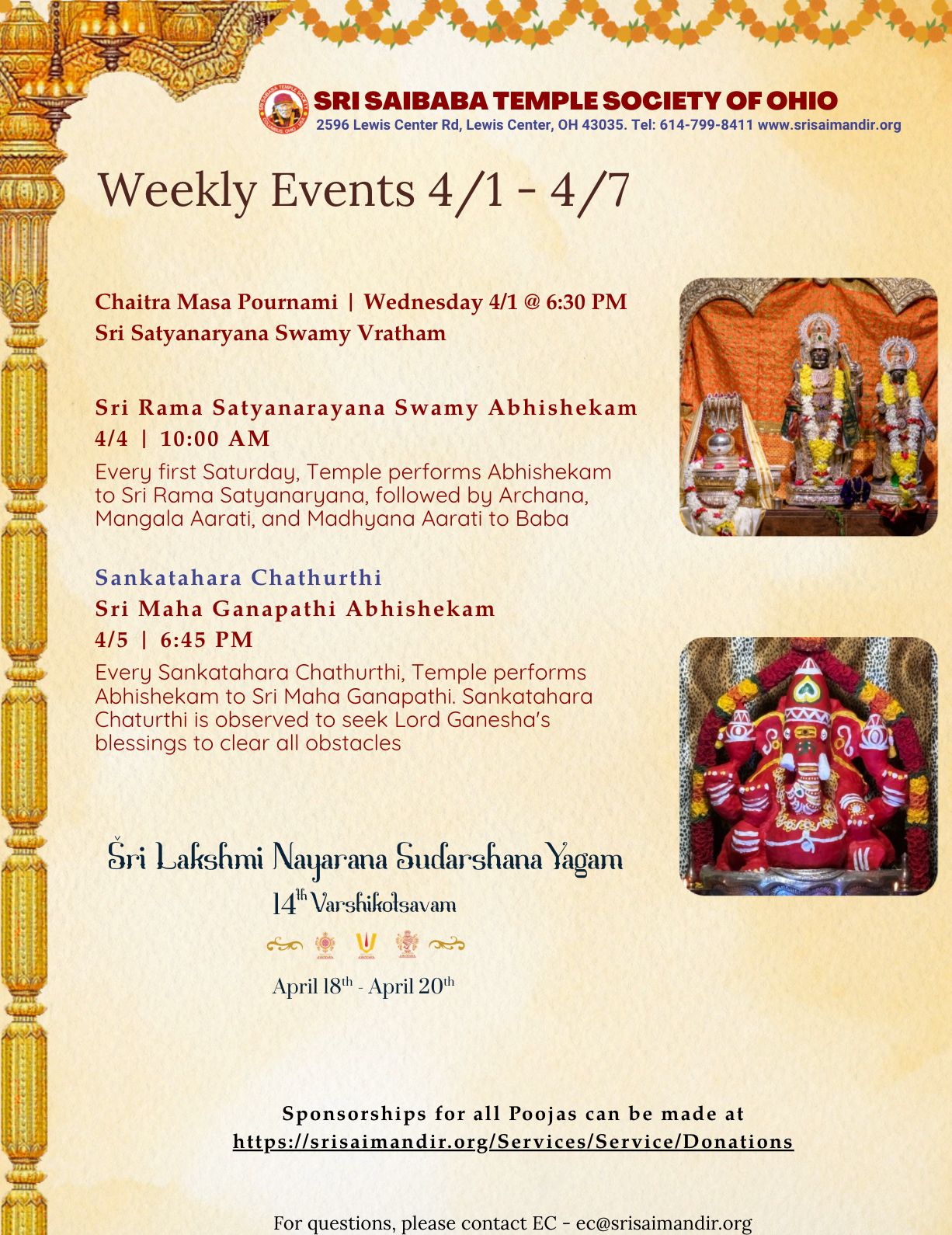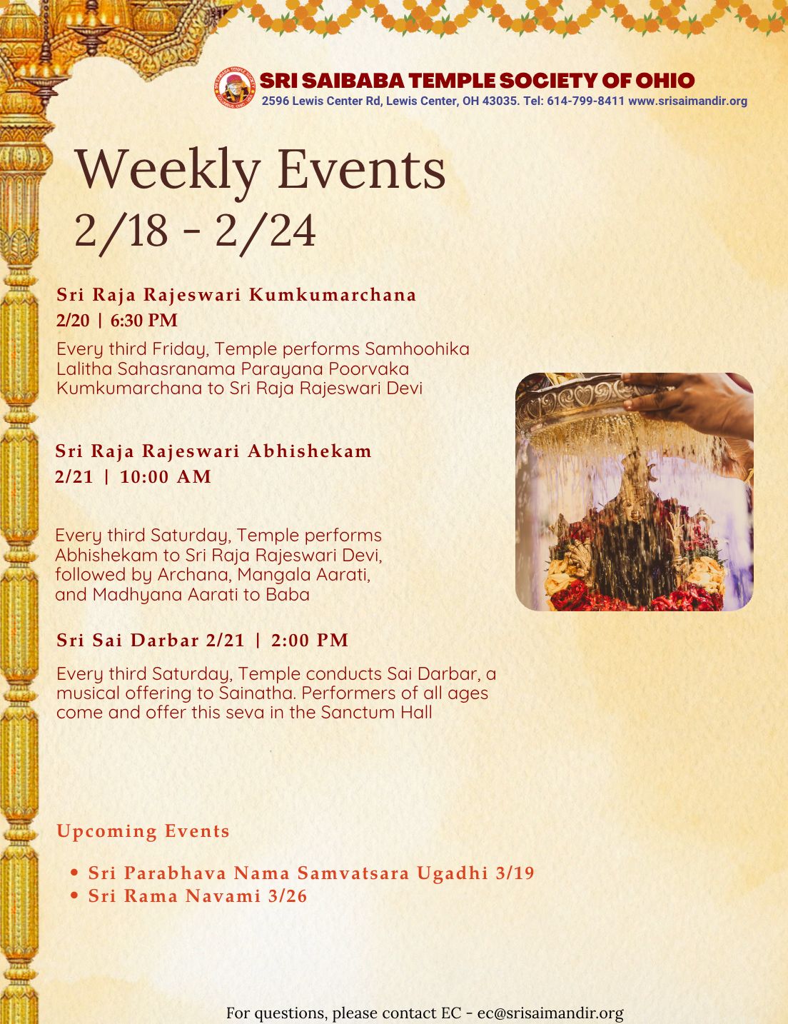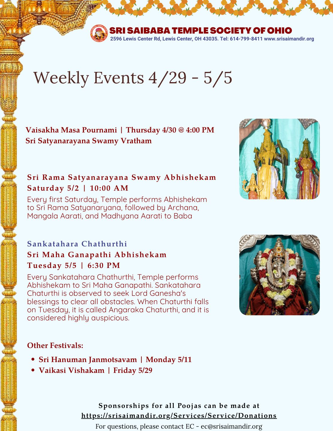 We all Hindus regard “Murthis” or “Vigrahas” as living manifestations of Divinity. In our Saibaba Temple we do have four different “Murthis”, along with our own Shirdi Saibaba in the center of the sanctum hall. After the temple was inaugurated and after “ Vigraha Prana Pratishta”, rituals need to be performed regularly according to Agama sastram. They are called “Utasavas”- and are performed nitya (daily) varotsava (weekly), paksha (fortnight), masotsava (monthly) etc Utsavams. As we may be missing some of these utsavas, our priests and Temple committee came up with these Abhishekams to each deity once a month to replenish the power for the “Murthis/Vigrahas”. Our Saibaba Temple has Sri Satyanarayana swamy Abhishekam on every first Saturday of the month, Sri Saibaba Abhishekam on every second Saturday of the month, Sri Rajarajeshwari Abhishekam on every third Saturday of the month, and Sri Hanuman Abhishekam on every fourth Saturday of the month. Typically “Panchamruthalu (five nectars)” – five different items are used for Abhishekam. They are Milk (Water), Yogurt (Earth), Ghee (Fire), Honey (Ether), Sugar (Air). Each of them is linked to one of the five elements of Nature. When we devotees do these panchamrutha abhishekam, we are essentially requesting the God to purify and balance the external physical world and our own subjective perception of it. Abhishekam, is performed pouring each one of the panchamrutha’s on to the Murthi with chanting of vedic mantras creating a vibrational effect which transforms the surrounding environment as well as the devotees who are witnessing and performing it. The positivity and spiritual energy created effortlessly uplifts everyone who attends the abhishekam. Abhishekams performed at home also gives similar effect or benefit, but witnessing or performing at temple when priests are performing to the Pranaprathista Murthies or Vigrahas, the effect is multiplied and enormous. So all devotees are requested to come and participate in Abhishekam every Saturday.