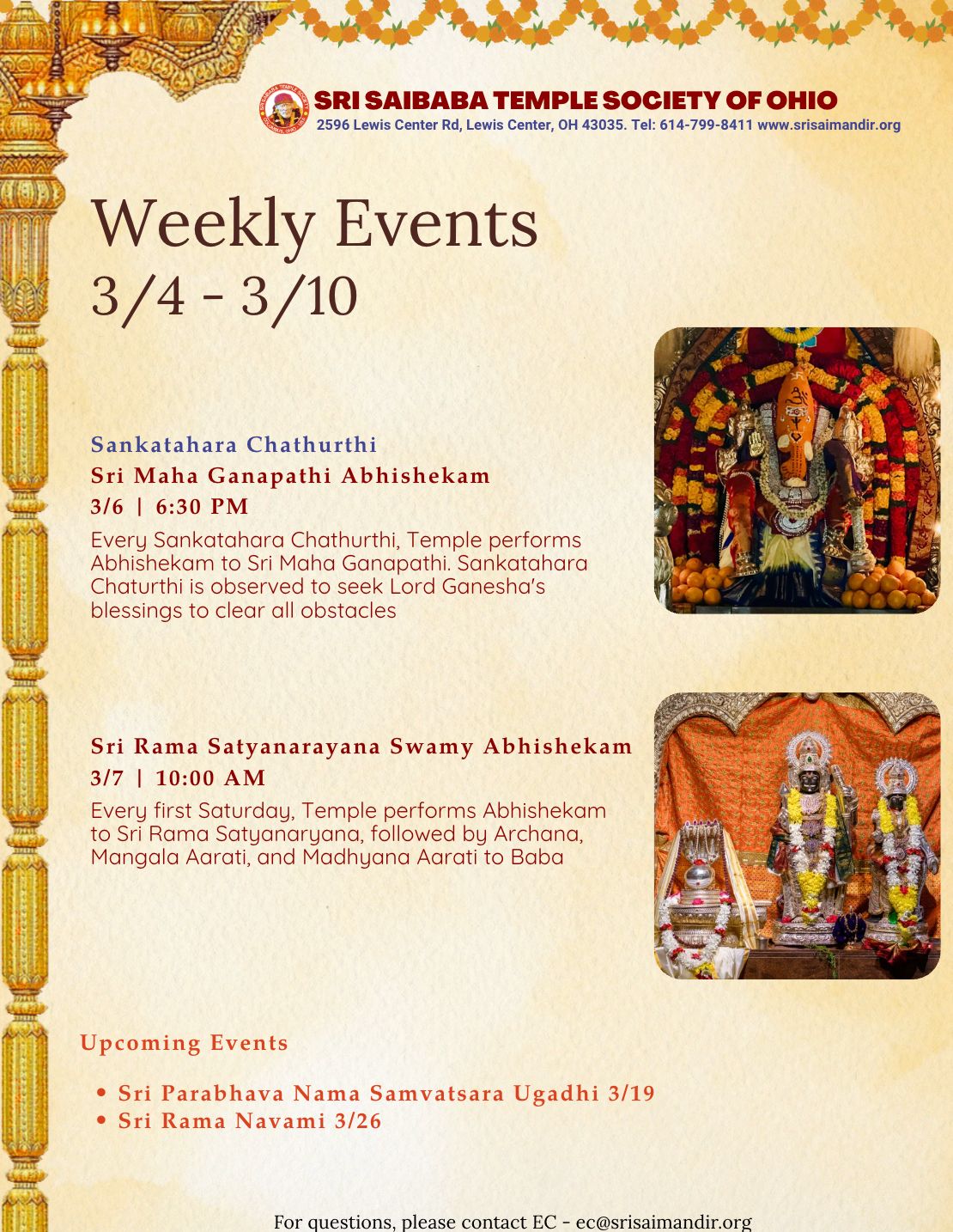In February 1999, few devotees of Saibaba joined together in a devotees house and conducted bhajan on a Thursday. The tradition was continued by performing bhajans on thursdays and weekends at the devotees house. Devotees number grew over a period of time to hundreds, space was leased at New Market Mall, Columbus to provide a central place of worship for all Saibaba devotees. By the will and grace of Sri Saibaba, Sri SaiBaba Temple Society of Ohio was formed and registered as a ‘not for profit’ organization in 2002. Initially all the rituals were performed by the devotees. Few months later Society hired a full time priest to conduct temple services 7 days a week. Later as the devotee numbers grew, a second priest was hired to celebrate all festivities round the year with special focus on Sri Saibaba events along with major festivals.