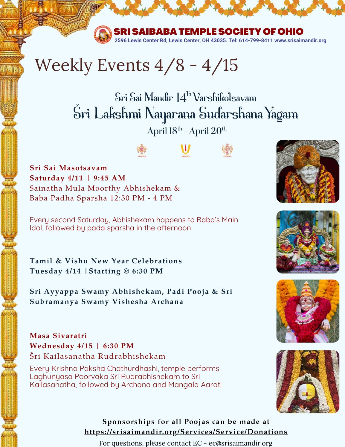 Foreseeing a phenomenal growth in the devotee numbers, the temple society decided to build a permanent temple for Sri Saibaba, and upalayas for Sri Maha Ganapathi, Sri AbhayaAnjaneya Swamy, Sri Raja Rajeshwari and Sri Hari Hara Hiranyagarbhathmaka Ramasahitha Veera Venkata Satyanarayana Swamy. In 2006, the Society purchased 7.73 acres of land on Lewis center Road in Lewis Center, Ohio. Sankhusthapana (Groundbreaking) for the new temple was performed in May 2010 and since then, the construction was done at a brisk pace. Sri SaiBaba Temple Society Of Ohio built a 16,484 sft temple with a total area of 7.73 acres. The newly built Sri Saibaba Temple Society of Ohio was completed and inaugurated with the Pranapratishta of SaiBaba Idol on April 25, 2012. The Baba’s idol was made of Italian marble and sculpted by the ‘Talim’s Art studio’, the same studio which carved the Saibaba Idol in Shirdi. The four Upalaya’s for Sri Maha Ganapathi, Sri AbhayaAnjaneya Swamy, Sri Raja Rajeshwari and Sri Hari Hara Hiranyagarbhathmaka Ramasahitha Veera Venkata Satyanarayana Swamy vigraha prana prathishta took place in April 2016, under the supervision of vedic scholars, stapathi and shilpi in a grand ceremony for 9 days. Accordingly, since taking the first step in 1999, With BABA’s divine grace and support of all devotees, an additional 5 acre land adjacent to the temple was purchased in 2014 for future use. In 2016 society has under taken a project to expand the parking lot and serve the needs of the growing number of devotees and completed the project in 2017 which provided much needed additional parking spots. To meet the devotional needs of the members of the society and temple, a third priest was hired in 2016.